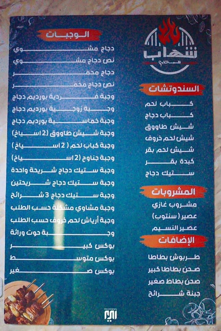 • مطعم شهاب للمشاوي يقدم أجمل وألذ أطباق المشاوي، باستخدام أجود أنواع اللحوم والتوابل، ليضمن لك تجربة طعام مميزة ومليئة بالنكهات الشهية. قائمة الأطباق: كباب لحم كباب دجاج شيش طاوق شيش لحم خروف شيش لحم بقر كبدة بقر ستيك دجاج